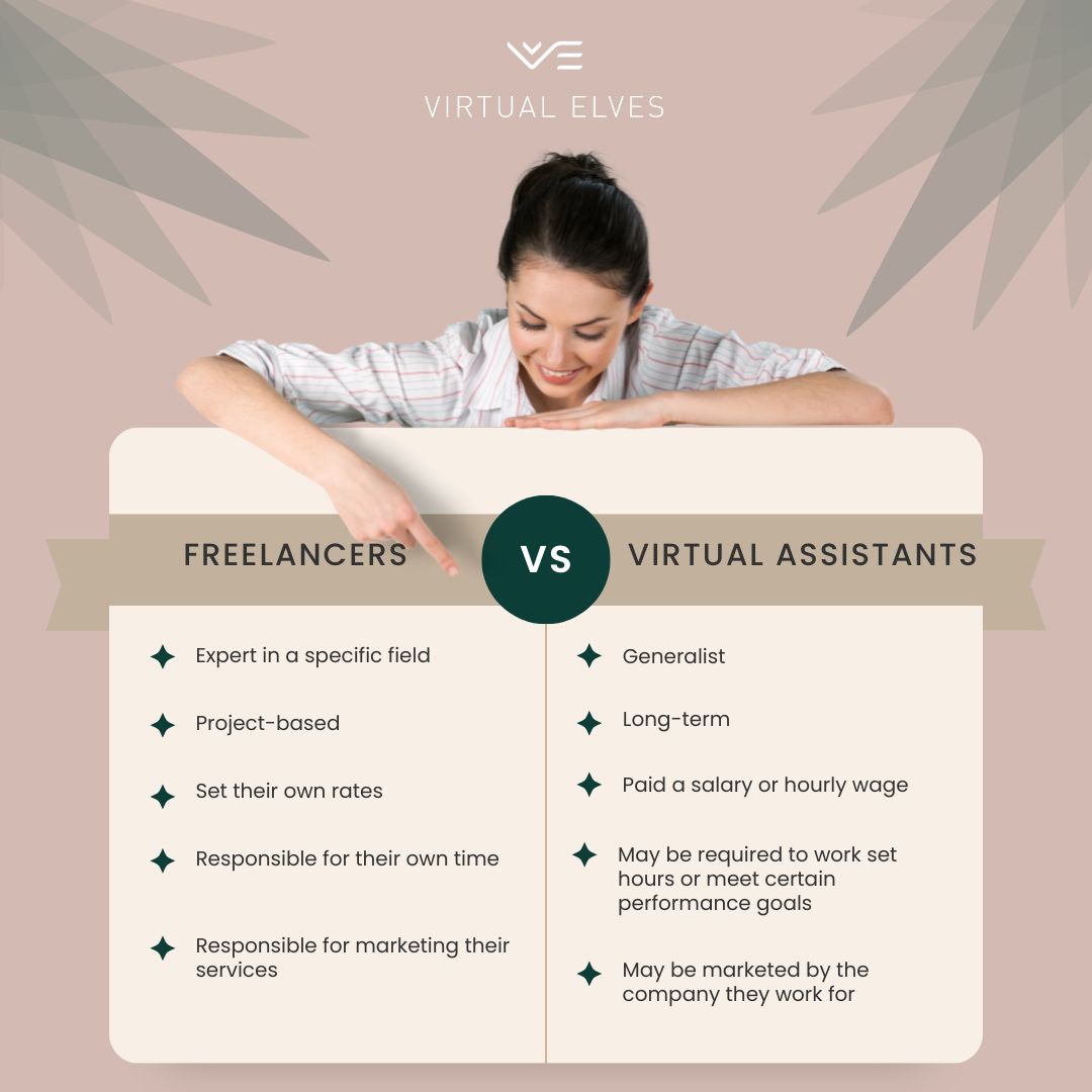 Freelancers and virtual assistants are both self-employed workers who provide services to businesses and individuals. However, there are some key differences between the two. Freelancers are typically experts in a specific field, such as writing, design, or development. They typically work on a project-by-project basis, and they may have multiple clients at the same time. Freelancers are responsible for setting their own rates, managing their own time, and marketing their services. Virtual assistants provide a wider range of services, including administrative support, customer service, and project management. They typically work for one or more clients on a long-term basis. Virtual assistants are typically paid a salary or hourly wage, and they may be required to work set hours or meet certain performance goals. Here is a table that summarizes the key differences between freelancers and virtual assistants: